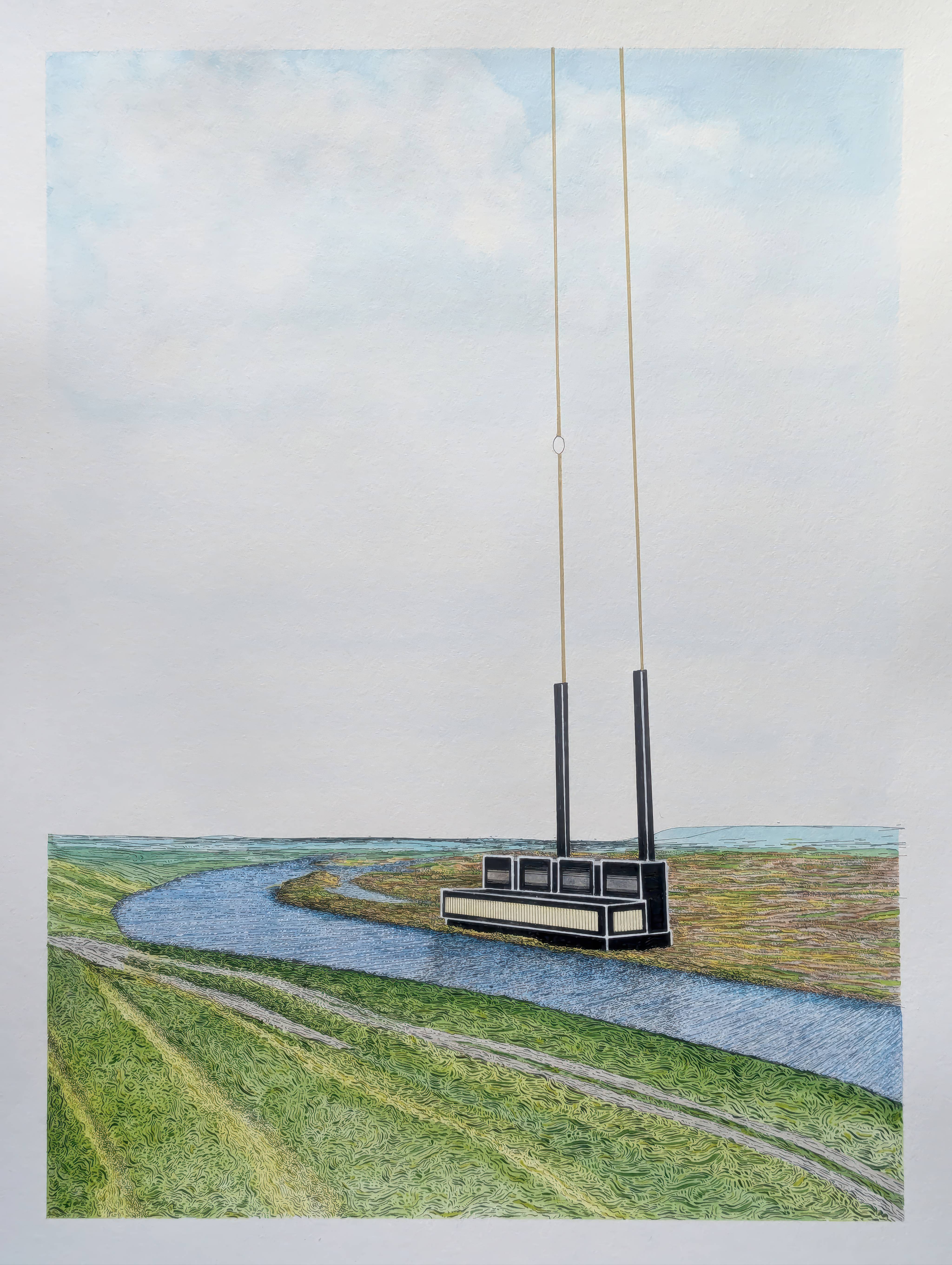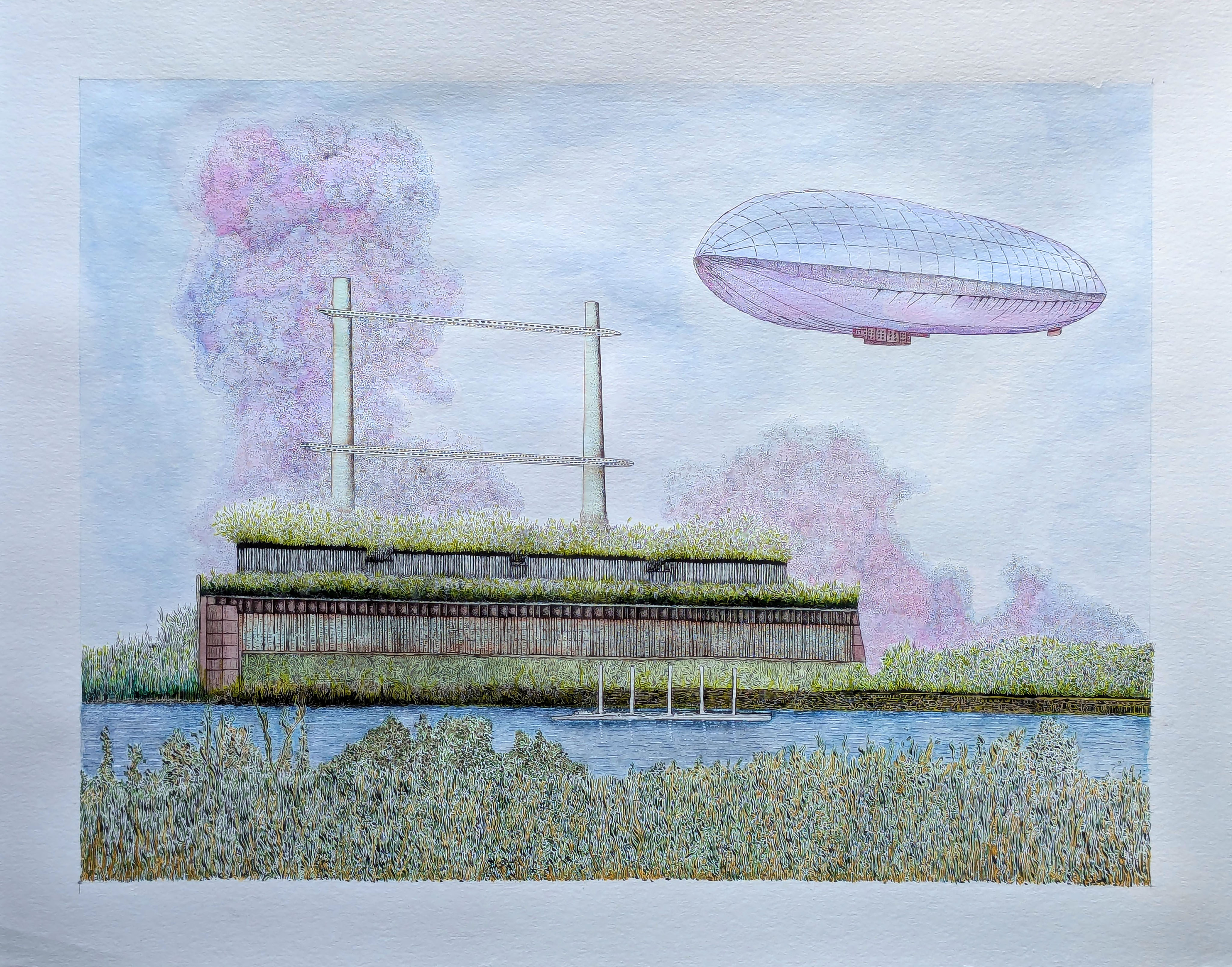 Through a series of five drawings and an animated video, I propose prospective visions, oscillating between utopian, techno-solutionist, and surrealist scenarios. These works blend vegetation, science fiction, and rapid urbanization to imagine possible futures for this site. The drawings and video unveil imaginary landscapes, both familiar and strange, where the present merges with hypothetical visions of the future.