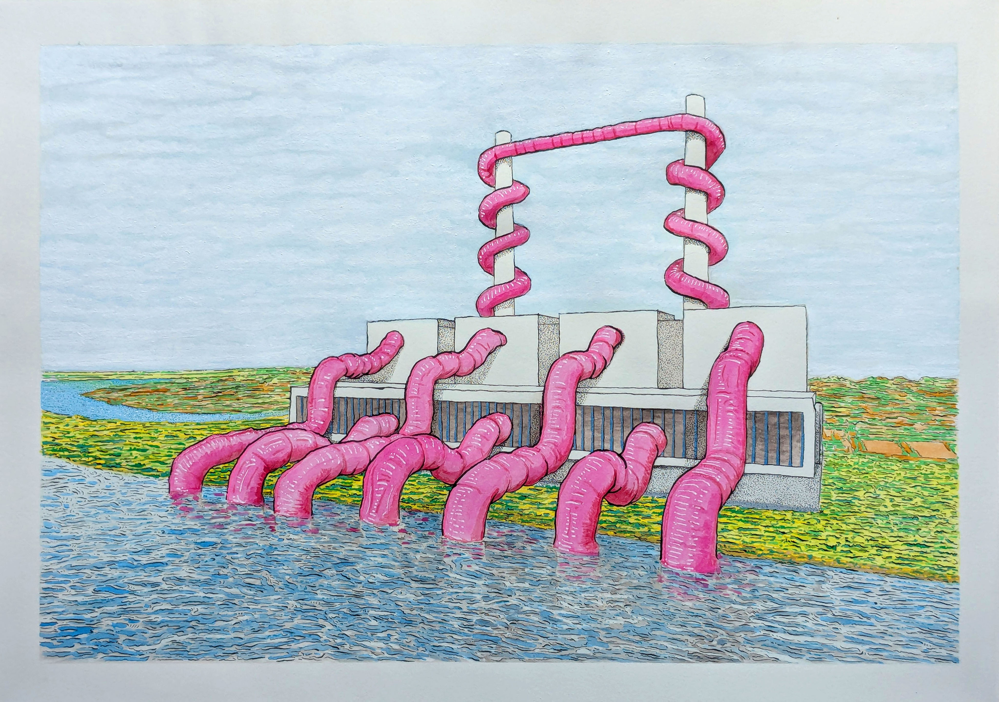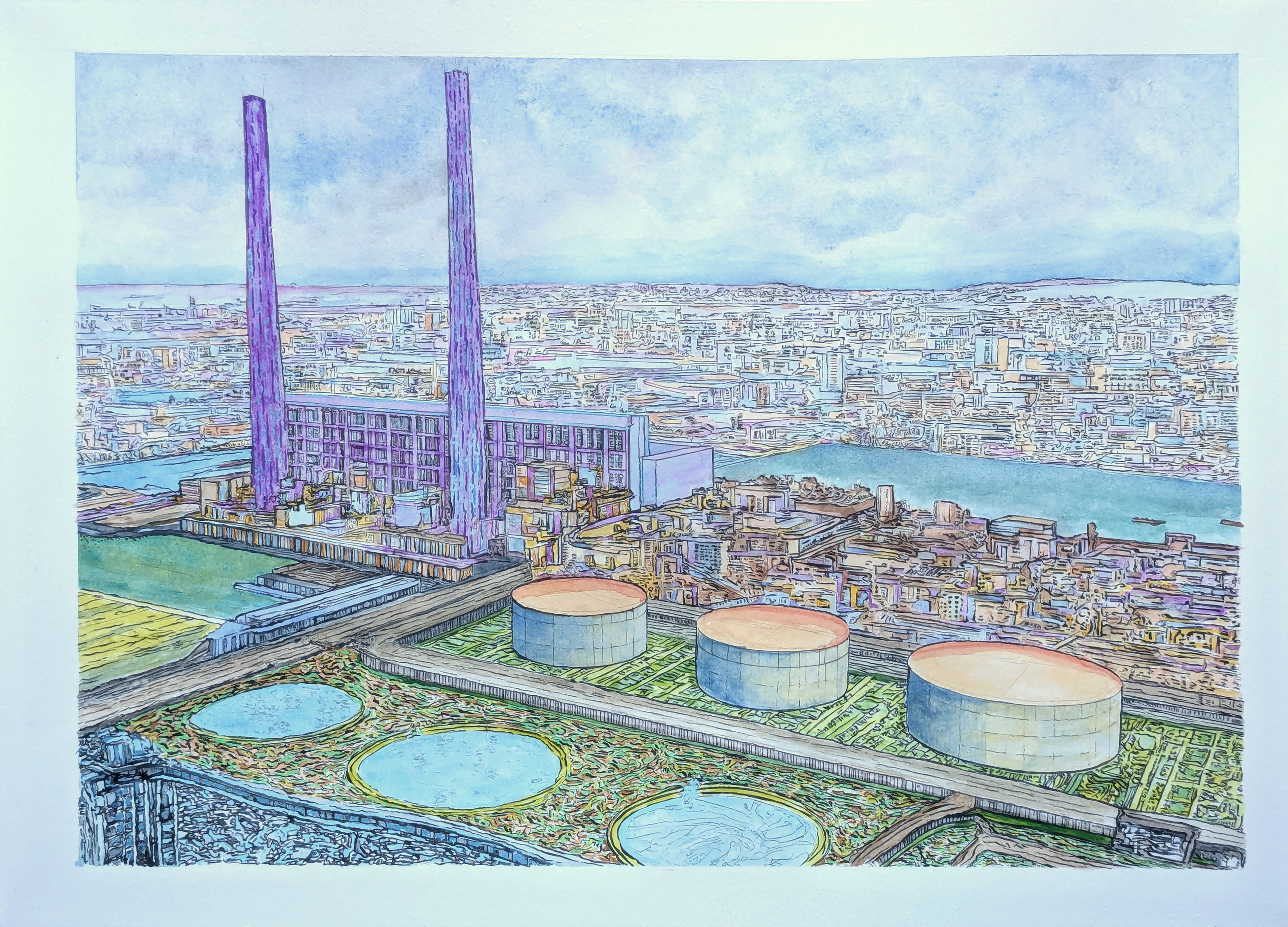 À travers une série de cinq dessins et une vidéo d’animation, je propose des visions prospectives, oscillant entre scénarios utopiques, techno-solutionnistes et surréalistes. Ces œuvres mêlent végétalisation, science-fiction et urbanisation galopante pour imaginer des futurs possibles pour ce lieu. Les dessins et la vidéo dévoilent des paysages imaginaires, à la fois familiers et étranges, où le présent fusionne avec des hypothèses d’avenir.